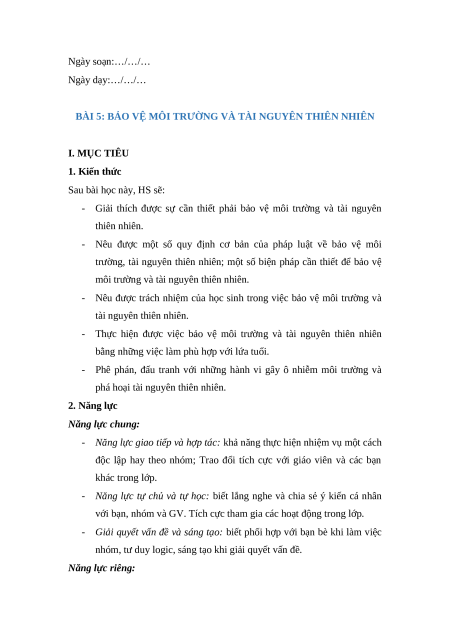 BÀI 5: BẢO VỆ MÔI TRƯỜNG VÀ TÀI NGUYÊN THIÊN NHIÊN I. MỤC TIÊU 1. Kiến thức Sau bài học này, HS sẽ: