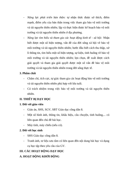 trường và tài nguyên thiên nhiên trong đời sống thực tế. 3. Phẩm chất
