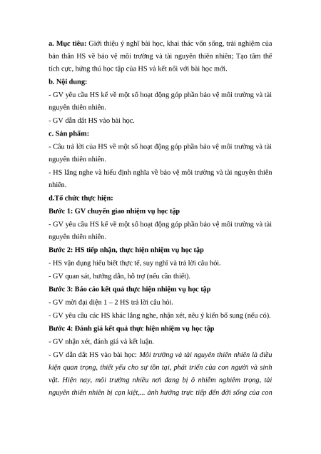 bản thân HS về bảo vệ môi trường và tài nguyên thiên nhiên; Tạo tâm thế