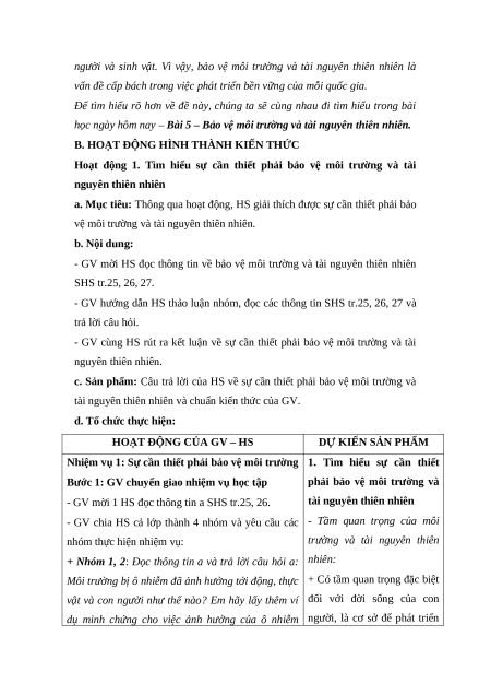 - GV mời HS đọc thông tin về bảo vệ môi trường và tài nguyên thiên nhiên SHS tr.25, 26, 27.