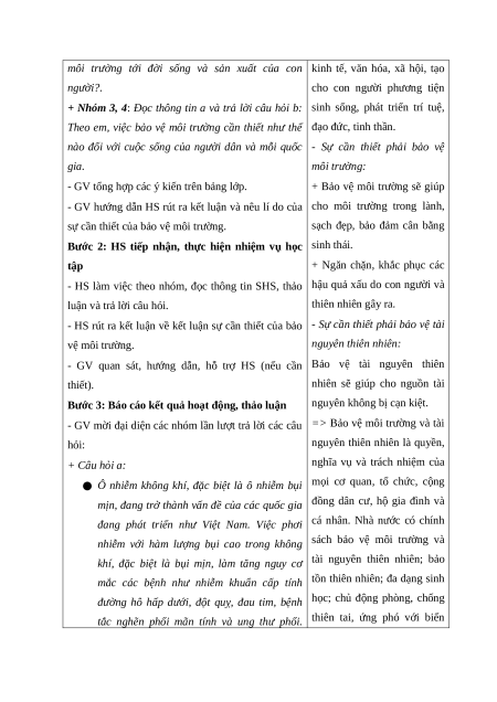 c. Sản phẩm: Câu trả lời của HS về sự cần thiết phải bảo vệ môi trường và