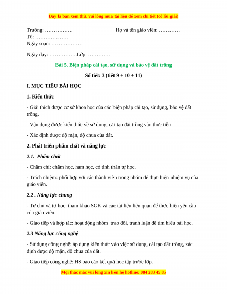Giáo án Bài 5: Biện pháp cải tạo, sử dụng và bảo vệ đất trồng Công nghệ 10 Cánh diều