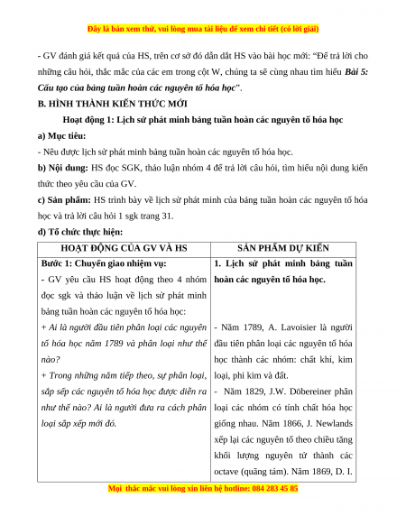 Hoạt động 1: Lịch sử phát minh bảng tuần hoàn các nguyên tố hóa học a) Mục tiêu: