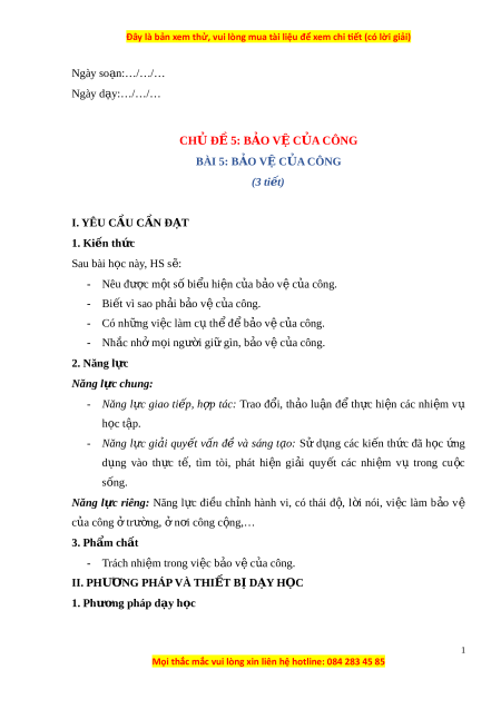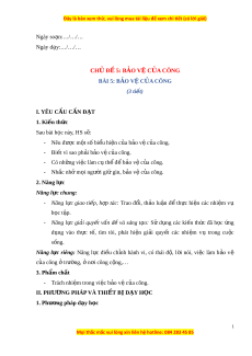 Ủ Ề 5: BẢO VỆ C A Ủ CÔNG BÀI 5: B O Ả V Ệ C A Ủ CÔNG (3 ti t ế ) I. YÊU C U Ầ C N Ầ Đ T Ạ 1. Ki n ế th c ứ Sau bài h c ọ này, HS s : ẽ - Nêu đ c ượ m t ộ s ố bi u ể hi n ệ c a ủ b o ả v ệ c a ủ công. - Bi t ế vì sao ph i ả b o ả v ệ c a ủ công. - Có nh n ữ g vi c ệ làm c ụ th ể đ ể b o ả v ệ c a ủ công. - Nh c ắ nh ở m i ọ ng i ườ gi ữ gìn, b o ả v ệ c a ủ công. 2. Năng l c ự Năng l c ự chung: - Năng l c ự giao ti p ế , h p ợ tác: Trao đ i ổ , th o ả lu n ậ để th c ự hi n ệ các nhi m ệ vụ h c ọ t p ậ . - Năng l c ự gi i ả quy t ế v n ấ đề và sáng t o ạ : Sử d n ụ g các ki n ế th c ứ đã h c ọ n ứ g d n ụ g vào th c ự t , ế tìm tòi, phát hi n ệ gi i ả quy t ế các nhi m ệ vụ trong cu c ộ sống. Năng l c