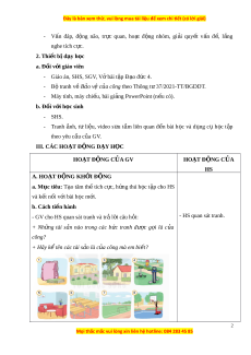 ủ công theo Thông t ư 37/2021-TT/BGDDT. - Máy tính, máy chi u ế , bài gi n ả g PowerPoint (n u ế có). b. Đ i ố v i ớ h c ọ sinh - SHS. - Tranh n ả h, tư li u ệ , video s u ư t m ầ liên quan đ n ế bài h c ọ và d n ụ g c ụ h c ọ t p ậ theo yêu c u ầ c a ủ GV. III. CÁC HO T Ạ Đ N Ộ G DẠY H C Ọ HO T Ạ ĐỘNG C A Ủ GV HO T Ạ ĐỘNG C A Ủ HS A. HOẠT ĐỘNG KH I Ở Đ N Ộ G a. M c ụ tiêu: T o ạ tâm th ế tích c c, ự h n ứ g thú h c ọ t p ậ cho HS và k t ế n i ố v i ớ bài h c ọ m i ớ . b. Cách ti n ế hành
