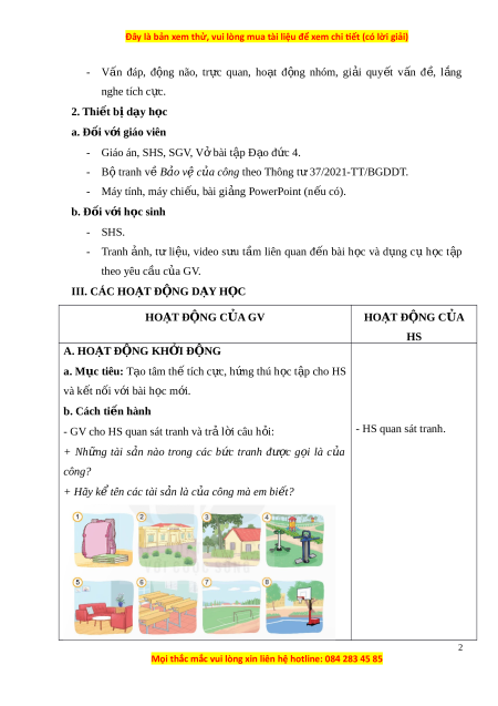 - Vấn đáp, đ n ộ g não, tr c ự quan, ho t ạ đ n ộ g nhóm, gi i ả quy t ế v n ấ đ , ề l n ắ g nghe tích c c. ự 2. Thi t ế b ị d y ạ h c ọ a. Đ i ố v i ớ giáo viên - Giáo án, SHS, SGV, V ở bài t p ậ Đ o ạ đ c ứ 4. - B ộ tranh v ề B o ả v ệ c a