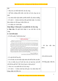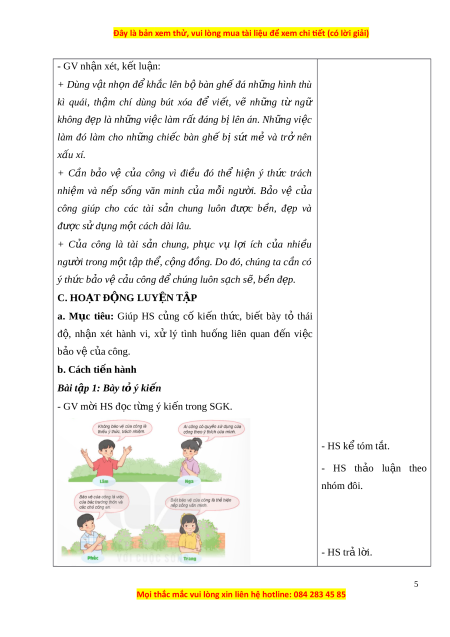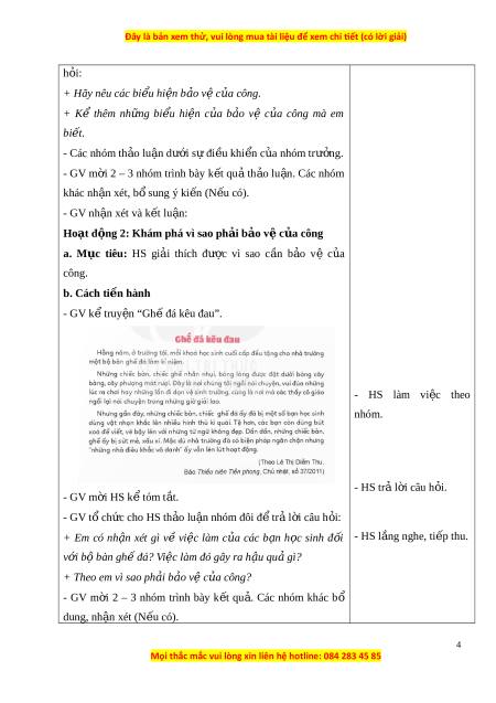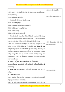 công” sẽ giúp các em hi u ể đ c ượ s ự quan tr n ọ g c a ủ công và bi t ế xây d n ự g cho mình ý th c ứ b o ả v ệ tài s n ả và môi tr n ườ g công c n ộ g như b o ả vệ tài s n ả và môi tr n ườ g s n ố g c a ủ chính mình. Tr c ướ là ở n i ơ các em đang s n ố g sau là nh n ữ g n i ơ mình đi qua. B. HO T Ạ Đ N Ộ G HÌNH THÀNH KI N Ế TH C Ứ Ho t ạ đ ng ộ 1: Tìm hi u ể m t ộ số bi u ể hi n ệ c a ủ b o ả vệ c a ủ công a. M c ụ tiêu: HS nêu đ c ượ m t ộ số bi u ể hi n ệ b o ả vệ c a ủ - HS đ c ọ SGK. công. b. Cách ti n ế hành - GV h n ướ g d n ẫ HS đ c ọ n i ộ dung các tr n ườ g h p ợ và k t ế h p ợ quan sát tranh minh h a. ọ - GV tổ ch c ứ cho HS làm vi c ệ theo nhóm 4 và trả l i ờ câu 3