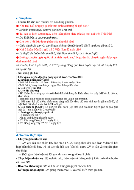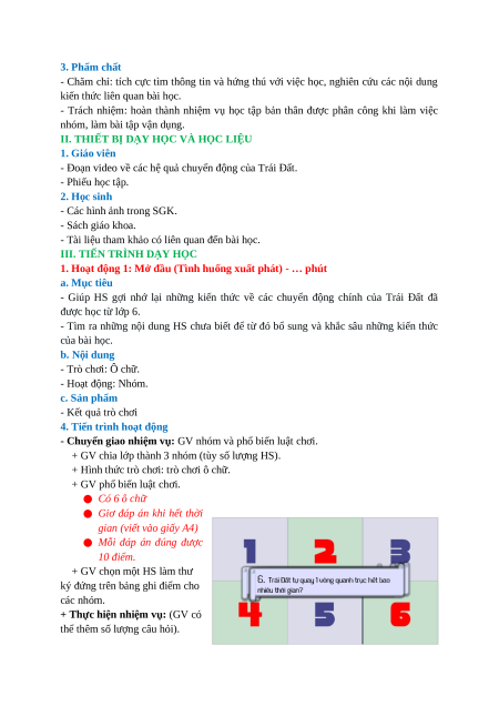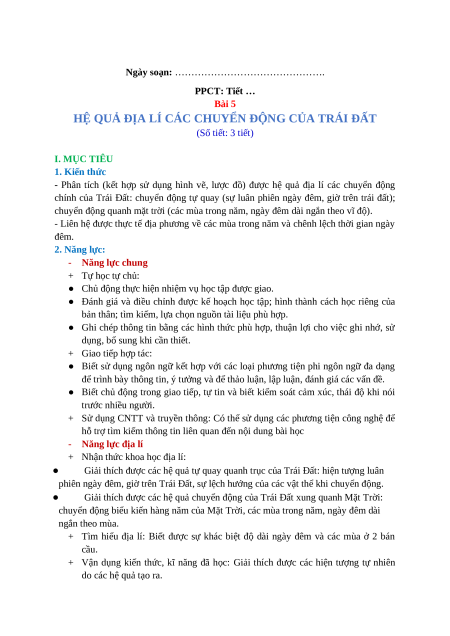 HỆ QUẢ ĐỊA LÍ CÁC CHUYỂN ĐỘNG CỦA TRÁI ĐẤT (Số tiết: 3 tiết) I. MỤC TIÊU 1. Kiến thức