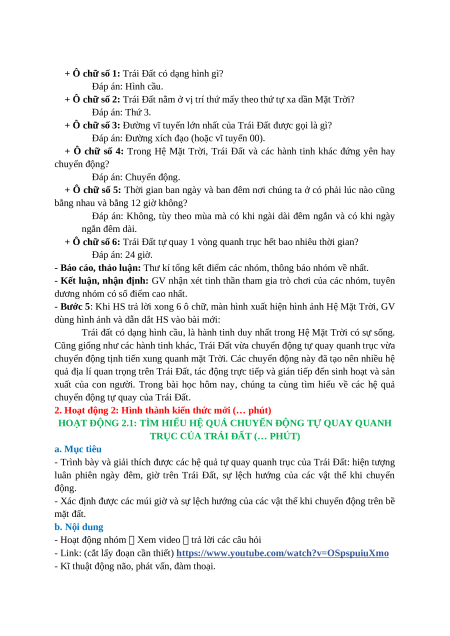 + Ô chữ số 6: Trái Đất tự quay 1 vòng quanh trục hết bao nhiêu thời gian? Đáp án: 24 giờ.