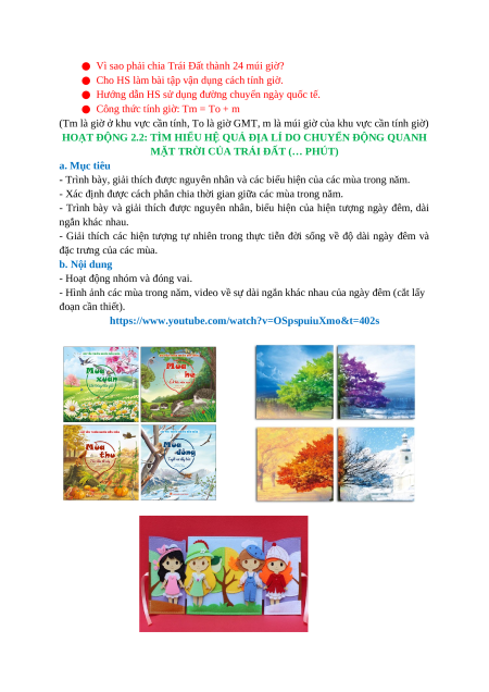 - Liên hệ được thực tế địa phương về các mùa trong năm và chênh lệch thời gian ngày