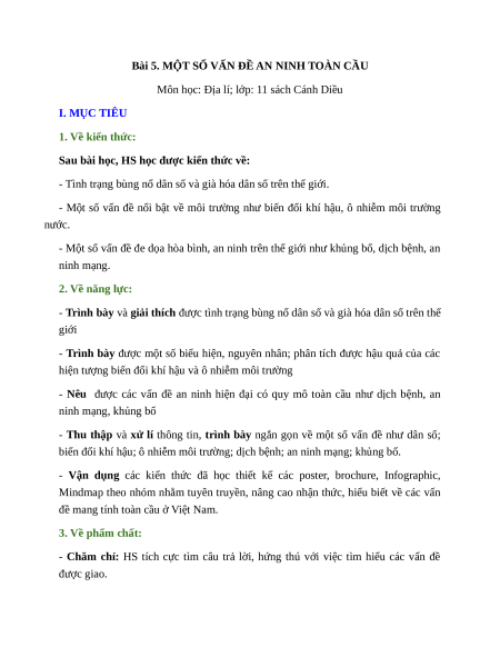 Giáo án Bài 5 Địa lí 11 Cánh diều (2024): Một số vấn đề an ninh toàn cầu