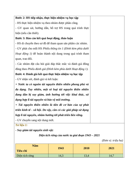 + Nhóm 3, 4: Tìm hiểu sự suy giảm tài nguyên sinh vật ở tài nguyên sinh vật ở nước nước ta.