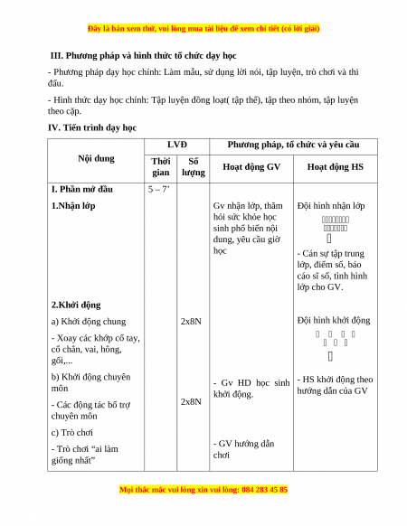 - Phương pháp dạy học chính: Làm mẫu, sử dụng lời nói, tập luyện, trò chơi và thi đấu.