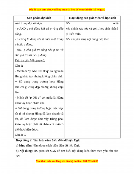 Hoạt động 2: b=/0cách biểu diễn dữ liệu lôgic