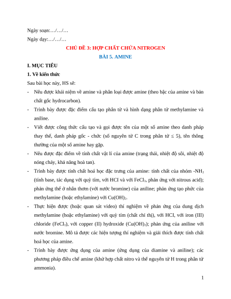 CHỦ ĐỀ 3: HỢP CHẤT CHỨA NITROGEN BÀI 5. AMINE I. MỤC TIÊU 1. Về kiến thức Sau bài học này, HS sẽ: