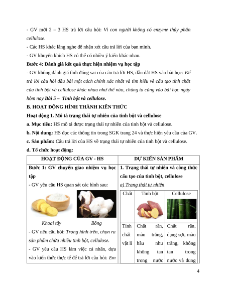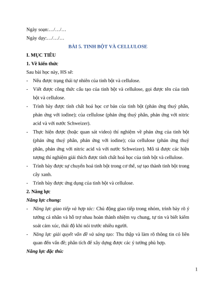 BÀI 5. TINH BỘT VÀ CELLULOSE I. MỤC TIÊU 1. Về kiến thức Sau bài học này, HS sẽ: