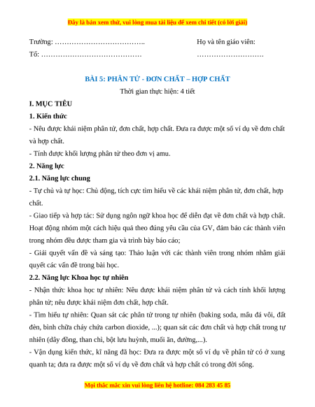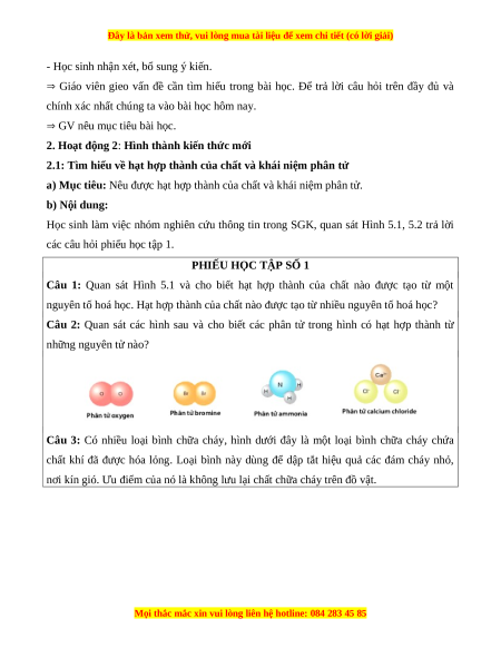 - Nhận thức khoa học tự nhiên: Nêu được khái niệm phân tử và cách tính khối lượng