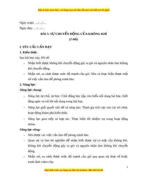 Ngày so n ạ : …/…/… Ngày d y ạ : …/…/… BÀI 5: S Ự CHUYỂN Đ N Ộ G C A Ủ KHÔNG KHÍ (2 ti t ế ) I. YÊU CẦU C N Ầ Đ T Ạ 1. Ki n ế th c ứ : Sau bài h c ọ này, HS s : ẽ - Nh n ậ bi t ế đ c ượ không khí chuy n ể đ n