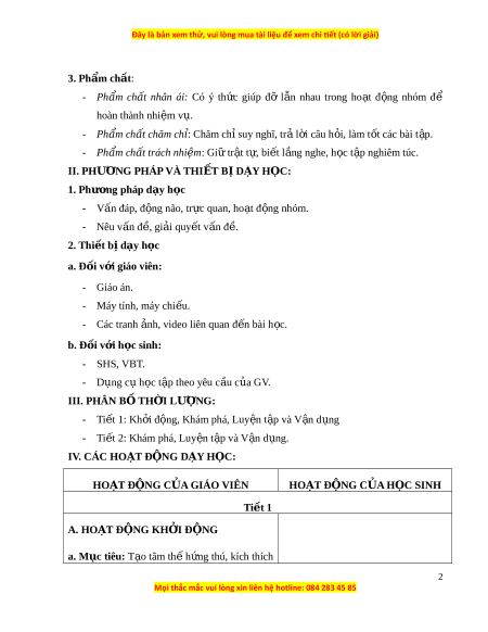 II. PHƯƠNG PHÁP VÀ THI T Ế B Ị D Y Ạ H C Ọ : 1. Phư ng ơ pháp d y ạ h c ọ - Vấn đáp, đ n ộ g não, tr c ự quan, ho t ạ đ n ộ g nhóm. - Nêu v n ấ đ , ề gi i ả quy t ế v n ấ đ . ề 2. Thi t ế b ị d y ạ h c ọ a. Đ i ố v i ớ giáo viên: - Giáo án. - Máy tính, máy chi u ế . - Các tranh n ả h, video liên quan đ n ế bài h c ọ . b. Đ i ố v i ớ h c ọ sinh: - SHS, VBT. - D n ụ g c ụ h c ọ t p ậ theo yêu c u ầ c a ủ GV. III. PHÂN B Ố TH I Ờ LƯ N Ợ G: - Ti t ế 1: Kh i ở đ n ộ g, Khám phá, Luy n ệ t p ậ và V n ậ d n ụ g - Ti t ế 2: Khám phá, Luy n ệ t p ậ và V n ậ d n ụ g. IV. CÁC HO T Ạ Đ N Ộ G D Y Ạ H C Ọ : HOẠT ĐỘNG C A Ủ GIÁO VIÊN HO T Ạ ĐỘNG C A Ủ H C Ọ SINH Tiết 1 A. HO T Ạ Đ N Ộ G KH I Ở Đ N Ộ G a. M c ụ tiêu: T o ạ tâm th ế h n ứ g thú, kích thích 2