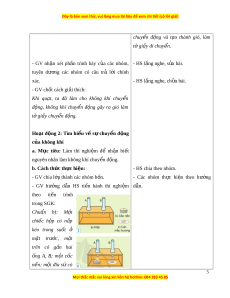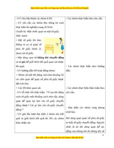 - GV chia l p ớ thành các nhóm 8 HS. - Các nhóm th c ự hi n ệ theo yêu c u ầ . - GV yêu c u ầ các nhóm đ c ọ thông tin cách th c ự hi n ệ thí nghi m ệ trang 20 SGK: Chu n ẩ b : ị M t ộ chi c ế qu t ạ và m t ộ t ờ gi y ấ . Ti n ế hành: • Đ t ặ tờ gi y ấ lên bàn. Đ n ứ g ra xa và qu t ạ về phía tờ gi y ấ (hình 2). Quan sát t ờ gi y ấ . • Hãy dùng c m