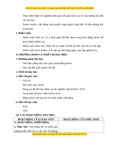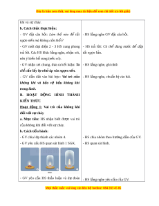 II. PHƯƠNG PHÁP VÀ THI T Ế B Ị D Y Ạ H C Ọ : 1. Phư ng ơ pháp d y ạ h c ọ - Vấn đáp, đ n ộ g não, tr c ự quan, ho t ạ đ n ộ g nhóm. - Nêu v n ấ đ , ề gi i ả quy t ế v n ấ đ . ề 2. Thi t ế b ị d y ạ h c ọ a. Đ i ố v i ớ giáo viên: - Giáo án. - Máy tính, máy chi u ế . - D n ụ g c ụ đ ể HS làm đ c ượ các thí nghi m ệ nh ư ở hình 1 SGK. - Tranh n ả h t ừ hình 3 đ n ế hình 6 SGK. - B n ả g nhóm, bút d , ạ bút chì ho c ặ ph n ấ vi t ế b n ả g. b. Đ i ố v i ớ h c ọ sinh: - SGK. - VBT. III. CÁC HO T Ạ Đ N Ộ G DẠY H C Ọ : HO T Ạ ĐỘNG C A Ủ GIÁO VIÊN HOẠT ĐỘNG C A Ủ H C Ọ SINH A. HOẠT ĐỘNG KH I Ở Đ N Ộ G a. M c ụ tiêu: T o ạ h n ứ g thú và kh i ơ g i ợ nh n ữ g hi u ể bi t ế đã có c a ủ HS về không M i