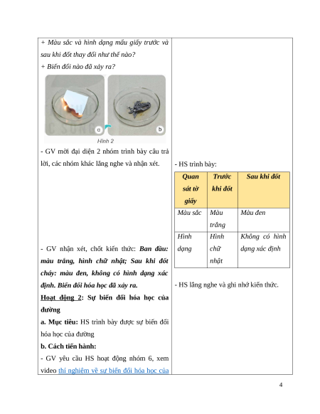 lời, các nhóm khác lắng nghe và nhận xét. - HS trình bày: Quan Trước Sau khi đốt sát tờ khi đốt giấy Màu sắc Màu Màu đen trắng Hình Hình Không có hình