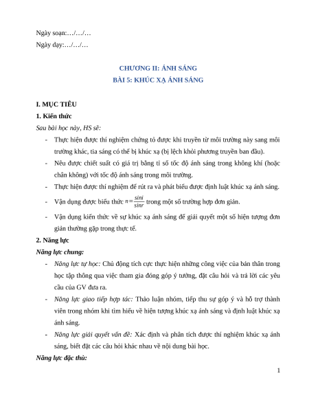 BÀI 5: KHÚC XẠ ÁNH SÁNG I. MỤC TIÊU 1. Kiến thức
