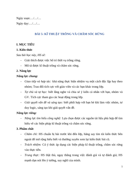 BÀI 5: KĨ THUẬT TRỒNG VÀ CHĂM SÓC RỪNG I. MỤC TIÊU 1. Kiến thức