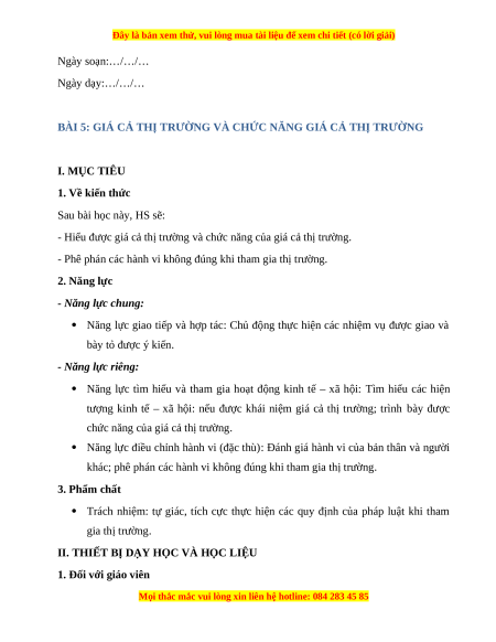 BÀI 5: GIÁ CẢ THỊ TRƯỜNG VÀ CHỨC NĂNG GIÁ CẢ THỊ TRƯỜNG I. MỤC TIÊU 1. Về kiến thức Sau bài học này, HS sẽ: