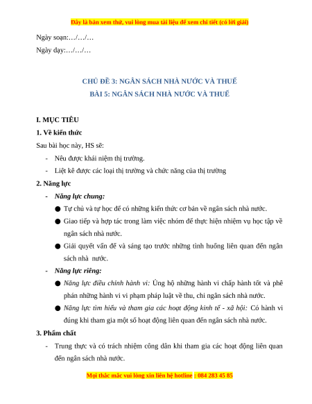 BÀI 5: NGÂN SÁCH NHÀ NƯỚC VÀ THUẾ I. MỤC TIÊU 1. Về kiến thức Sau bài học này, HS sẽ: