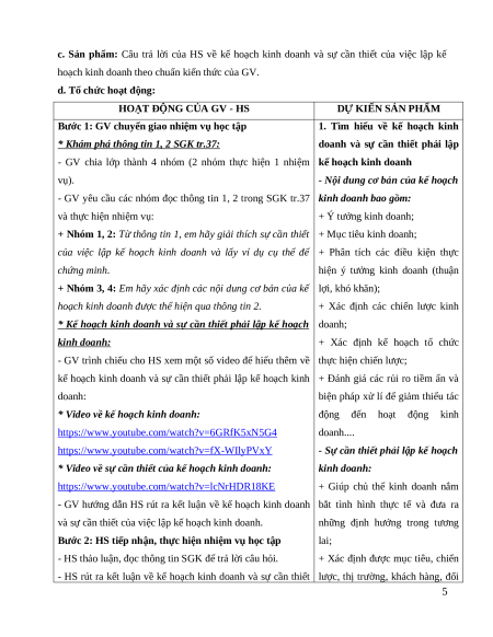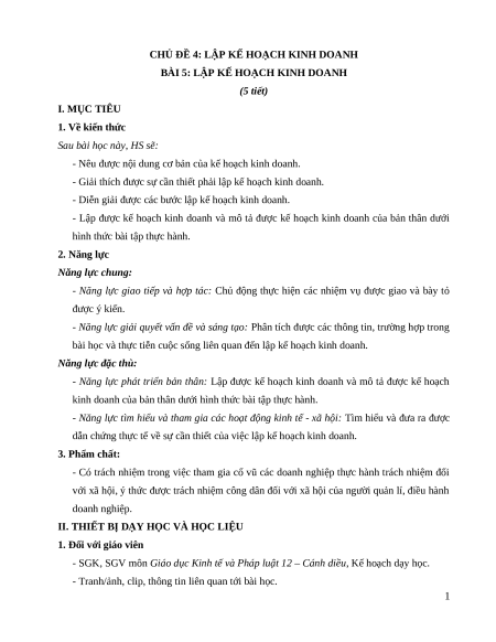 BÀI 5: LẬP KẾ HOẠCH KINH DOANH (5 tiết) I. MỤC TIÊU 1. Về kiến thức
