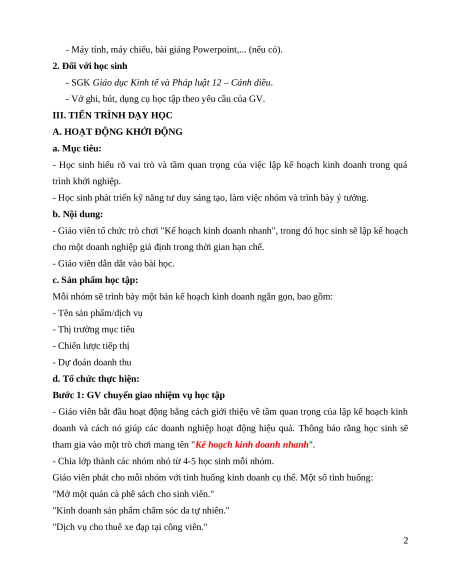 - Giáo viên bắt đầu hoạt động bằng cách giới thiệu về tầm quan trọng của lập kế hoạch kinh
