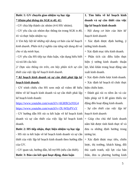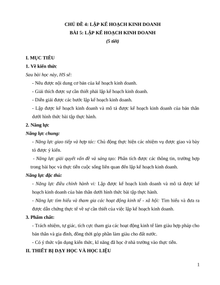 BÀI 5: LẬP KẾ HOẠCH KINH DOANH (5 tiết) I. MỤC TIÊU 1. Về kiến thức