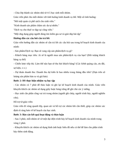 - Giáo viên tổ chức trò chơi "Kế hoạch kinh doanh nhanh", trong đó học sinh sẽ lập kế hoạch