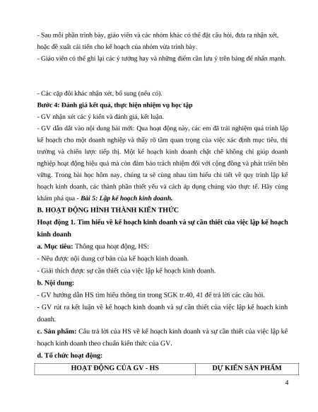 - Giáo viên bắt đầu hoạt động bằng cách giới thiệu về tầm quan trọng của lập kế hoạch kinh