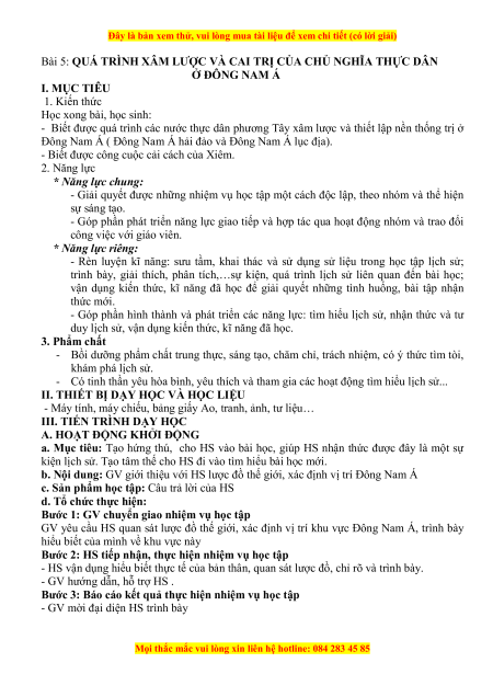 Bài 5: QUÁ TRÌNH XÂM LƯỢC VÀ CAI TRỊ CỦA CHỦ NGHĨA THỰC DÂN Ở ĐÔNG NAM Á I. MỤC TIÊU 1. Kiến thức Học xong bài, học sinh: