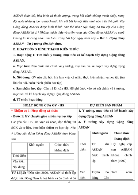 BÀI 5: CỘNG ĐỒNG ASEAN: TỪ Ý TƯỞNG ĐẾN HIỆN THỰC (2 TIẾT) I. MỤC TIÊU 1. Kiến thức