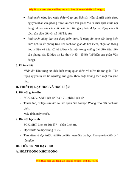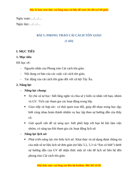 BÀI 5: PHONG TRÀO CẢI CÁCH TÔN GIÁO (1 tiết) I. MỤC TIÊU 1. Mục tiêu HS học về: