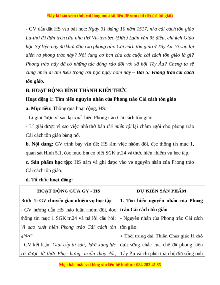 Giáo án Bài 5 Lịch sử 7 Chân trời sáng tạo: Phong trào cải cách tôn giáo (phiên bản 2)