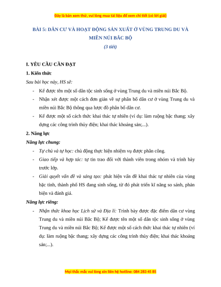 BÀI 5: DÂN CƯ VÀ HOẠT ĐỘNG SẢN XUẤT Ở VÙNG TRUNG DU VÀ MIỀN NÚI BẮC BỘ (3 tiết)