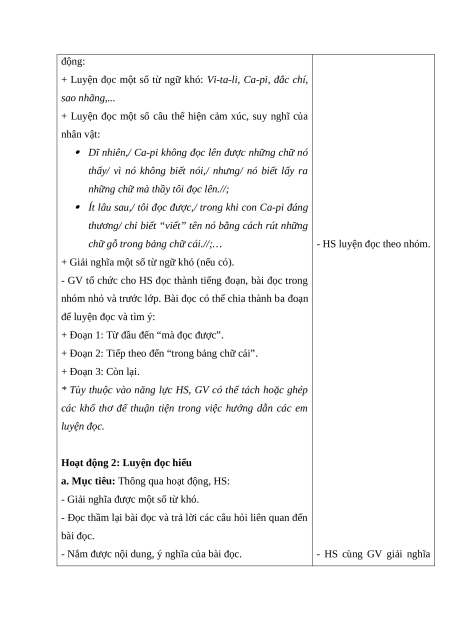 + Luyện đọc một số từ ngữ khó: Vi-ta-li, Ca-pi, đắc chí, sao nhãng,...