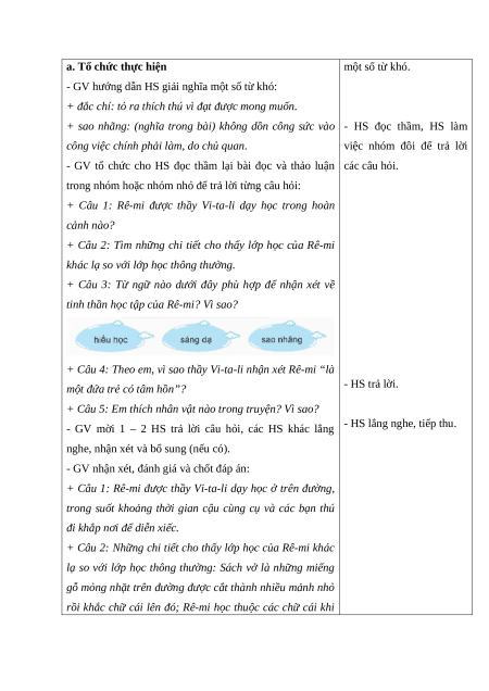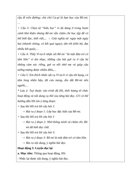 xúc của các nhân vật; giọng cụ Vi-ta-li trầm ấm, giọng hướng dẫn của GV. Rê-mi trong trẻo,...