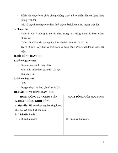 - Nêu và thực hiện được việc làm thiết thực để tiết kiệm năng lượng chất đốt. 3. Phẩm chất: