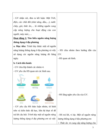 Giáo án Bài 5: Năng lượng và năng lượng chất đốt Khoa học lớp 5 Cánh diều