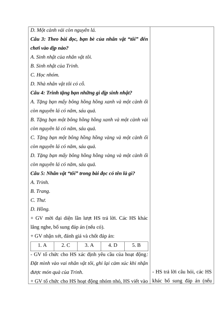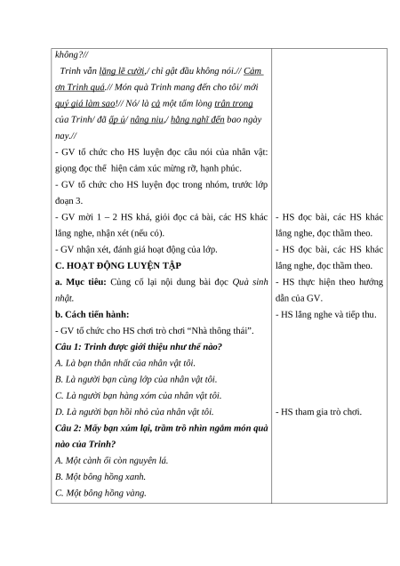 - Đóng vai nhân vật Trang trong bài “Quà sinh nhật”, nói được lời cảm
