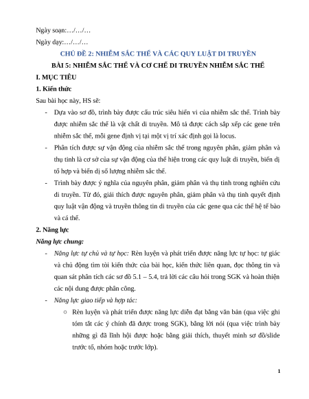 BÀI 5: NHIỄM SẮC THỂ VÀ CƠ CHẾ DI TRUYỀN NHIỄM SẮC THỂ I. MỤC TIÊU 1. Kiến thức Sau bài học này, HS sẽ: