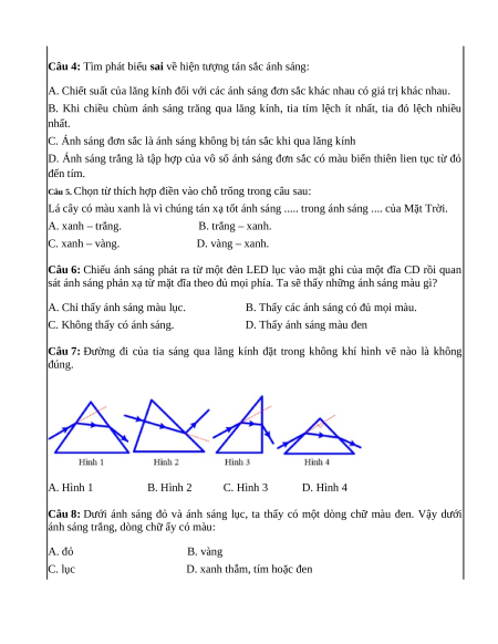 Câu 4: Tìm phát biểu sai về hiện tượng tán sắc ánh sáng: