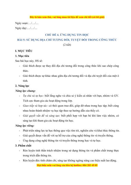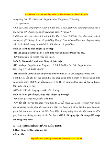 BÀI 5: SỬ DỤNG ĐỊA CHỈ TƯƠNG ĐỐI, TUYỆT ĐỐI TRONG CÔNG THỨC (2 tiết) I. MỤC TIÊU 1. Mục tiêu Sau bài học này, HS sẽ: