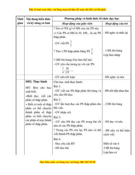 - GV yêu cầu tương tự với các PS: 7 20 , ... 4 125 - GV nêu kết luận - HS nghe và nêu HĐ2. Thực hành Cho học sinh thực hành: Bài 1: MT: Rèn cho học sinh biết:
