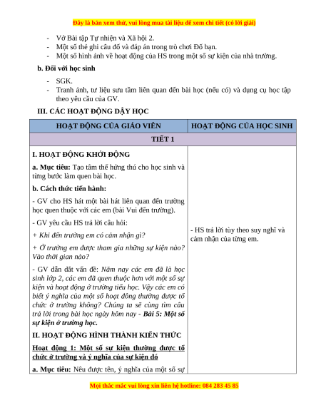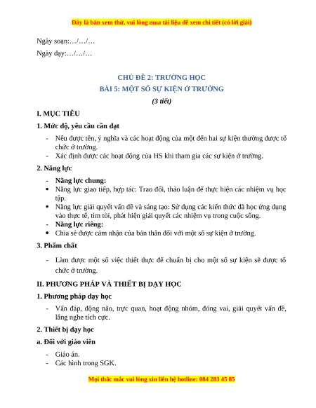 BÀI 5: MỘT SỐ SỰ KIỆN Ở TRƯỜNG (3 tiết) I. MỤC TIÊU